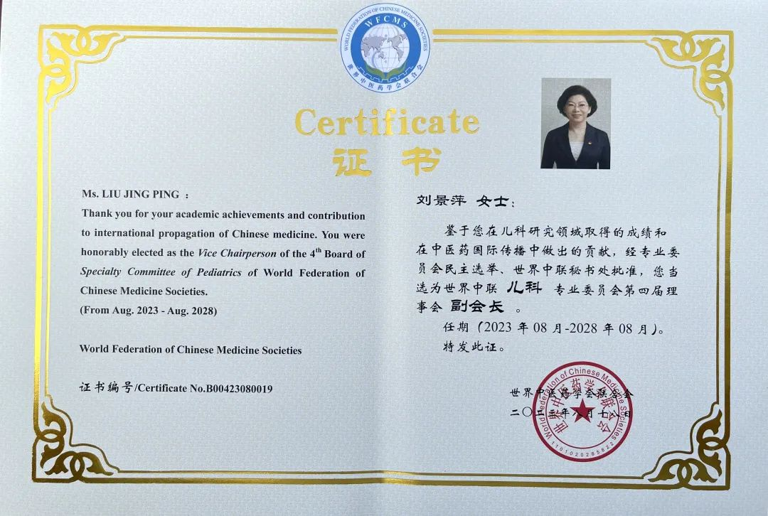 7790必发集团药业集团党委书记、董事长刘景萍当选世界中医药学会联合会儿科专业委员会第四届理事会副会长